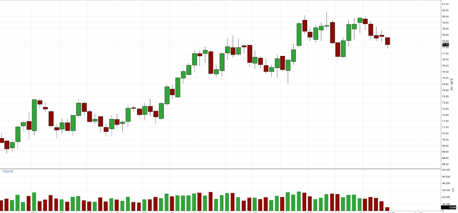 The overall trend retains an indicatively bullish undertone, but momentum has softened. A break below the €76.00–€74.00 zone could open room for deeper correction, while holding above this area would provide the possibility for the path to open toward €80.00 and beyond.