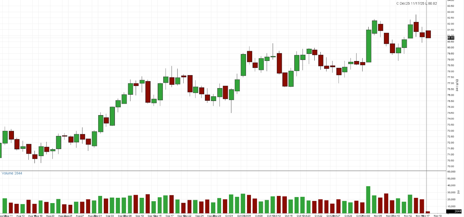 EUAs continue to stabilise after the recent peak around €82.66, with the December 2025 contract now trading near €80.50. The price remains above all major moving averages, with the 20-day MA (€78.50) and 50-day MA (€78.42) acting as the first layers of dynamic support. The 100-day MA (€75.14) continues to serve as firm medium-term structural support. Bollinger Bands remain relatively wide, while the price is holding in the upper part of the range but showing a mild pullback, typical behaviour after a strong upward move as the market cools off. Momentum indicators remain mostly positive. The RSI at 57.09 signals healthy but not excessive buying pressure. The MACD at 0.86 stays in positive territory and above its signal line, aligning with the underlying bullish structure. The CCI at 68.39 also points to a mildly bullish bias without indicating overheating.